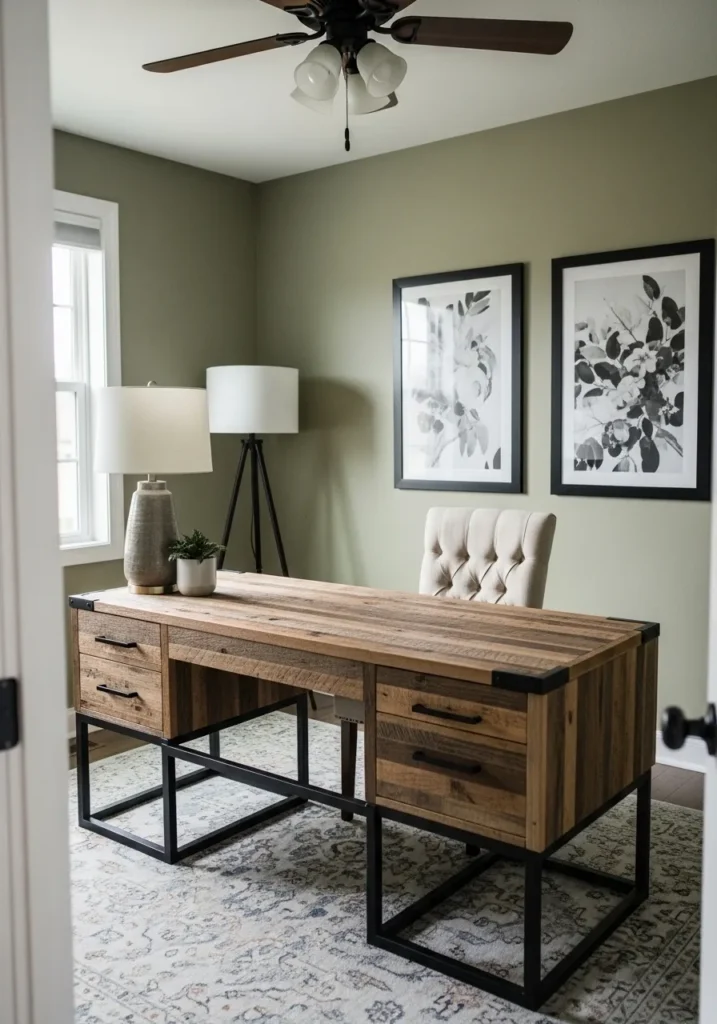 This office is painted in a soft earthy olive green that feels grounded and calm. The warm wood desk with black metal legs adds a subtle modern farmhouse vibe, while the framed botanical prints tie everything together beautifully. The neutral rug and simple lamp keep the space light and balanced. Natural light from the window softens the green tone, giving the whole room a relaxed and welcoming atmosphere.