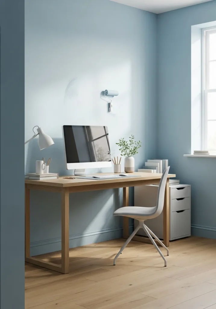 This workspace features a gentle pale blue wall that instantly makes the room feel open and bright. The simple wood desk and white chair keep the look fresh and uncluttered. Sunlight filters through the window and casts soft shadows on the wall, adding subtle dimension to the paint color. The overall design feels clean, calm, and perfectly balanced.