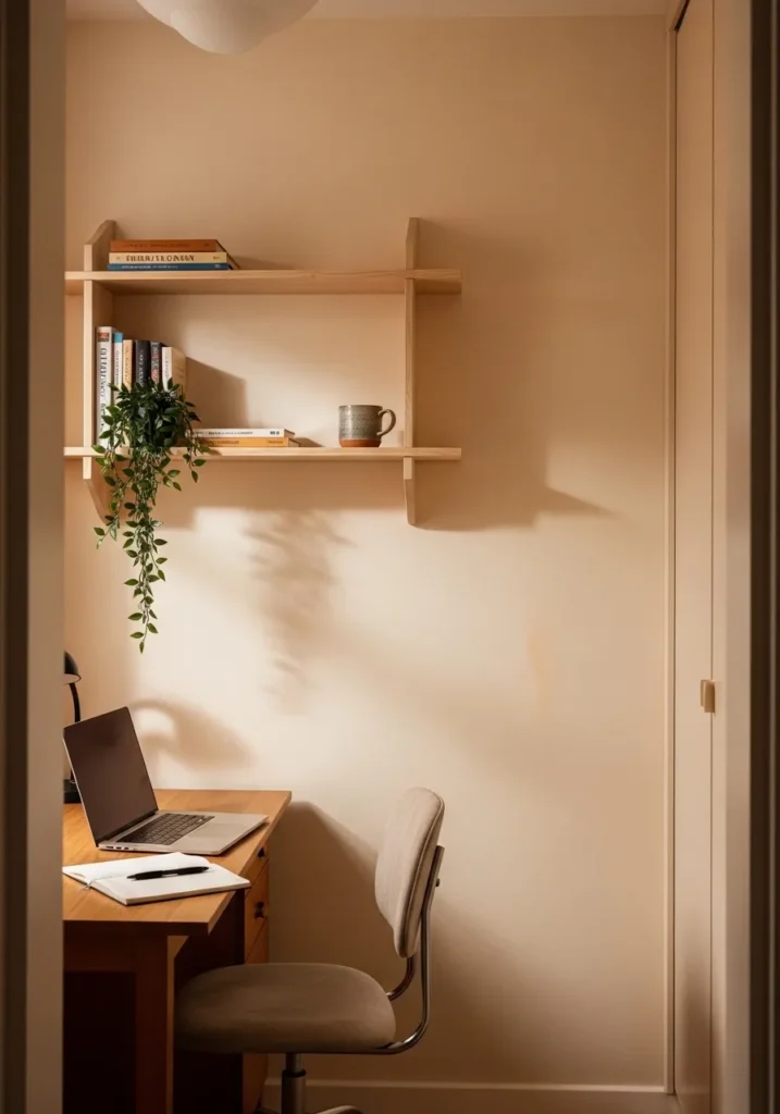 This cozy office nook is painted in a soft warm beige that feels inviting and easy to live with. Floating shelves above the desk provide simple storage while keeping the wall visually light. The neutral tone reflects natural light gently, making the small space feel brighter and more open. The overall look is understated but thoughtfully styled.