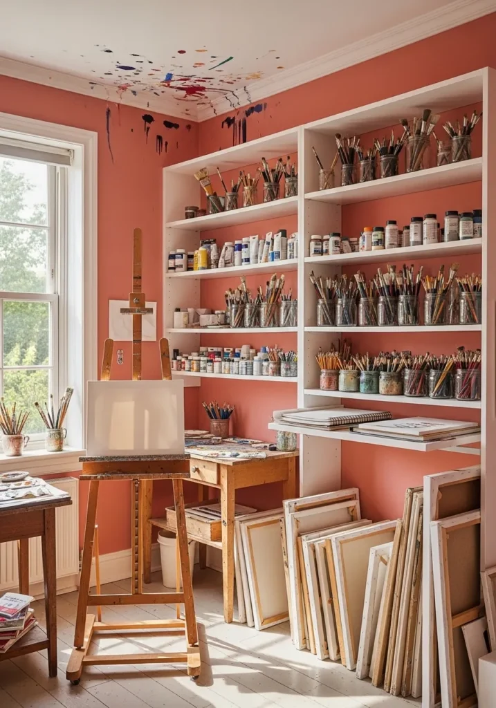 This office bursts with personality thanks to its vibrant coral walls and floor to ceiling shelving filled with art supplies. The warm pink orange tone wraps the entire room, creating an energizing backdrop for canvases, brushes, and neatly stacked frames. Natural light pours in through the window and makes the coral paint glow beautifully against the light wood floors. The open shelves keep everything visible and accessible, turning storage into part of the design.