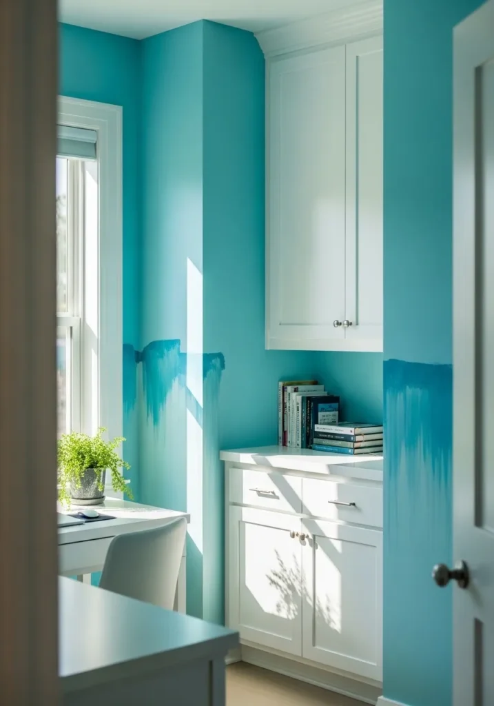 This office features a bold turquoise wall that instantly lifts the mood of the room. The vivid blue green shade contrasts beautifully with crisp white cabinetry and trim, creating a clean and modern look. Sunlight highlights the glossy finish of the paint, giving the space a fresh and lively feel. The layout is simple and uncluttered, allowing the color to truly shine.