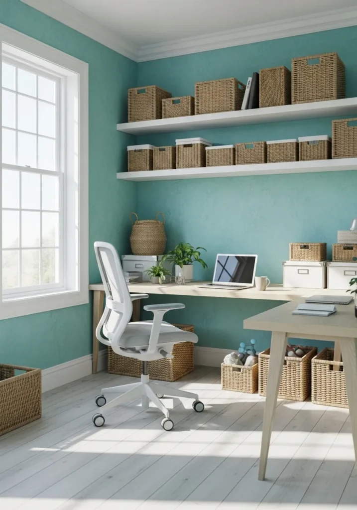 This office is wrapped in a gentle aqua tone that feels light, breezy, and uplifting. The pale blue green walls pair beautifully with white shelves and woven storage baskets. Natural light fills the room and makes the paint look soft and inviting. The simple desk setup keeps the space practical while still feeling cheerful and stylish.