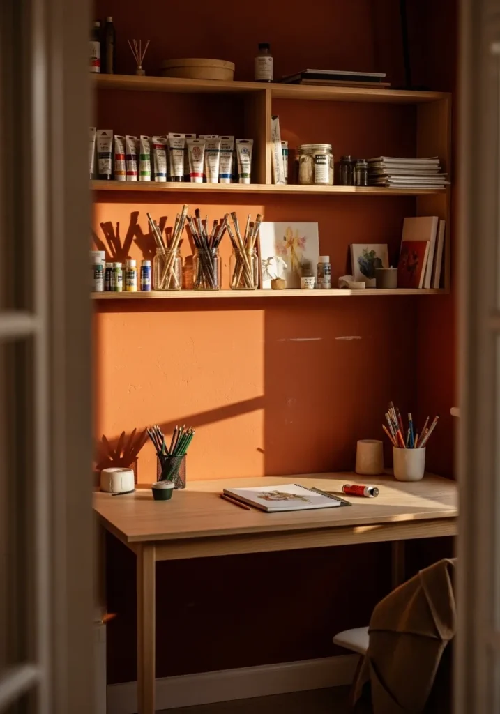 I absolutely adore how fearless this color choice feels. Coral brings such a playful and confident energy into the space, which is perfect for creative work. It feels joyful and expressive without being chaotic. I can easily imagine spending hours here painting, planning, and feeling completely inspired.