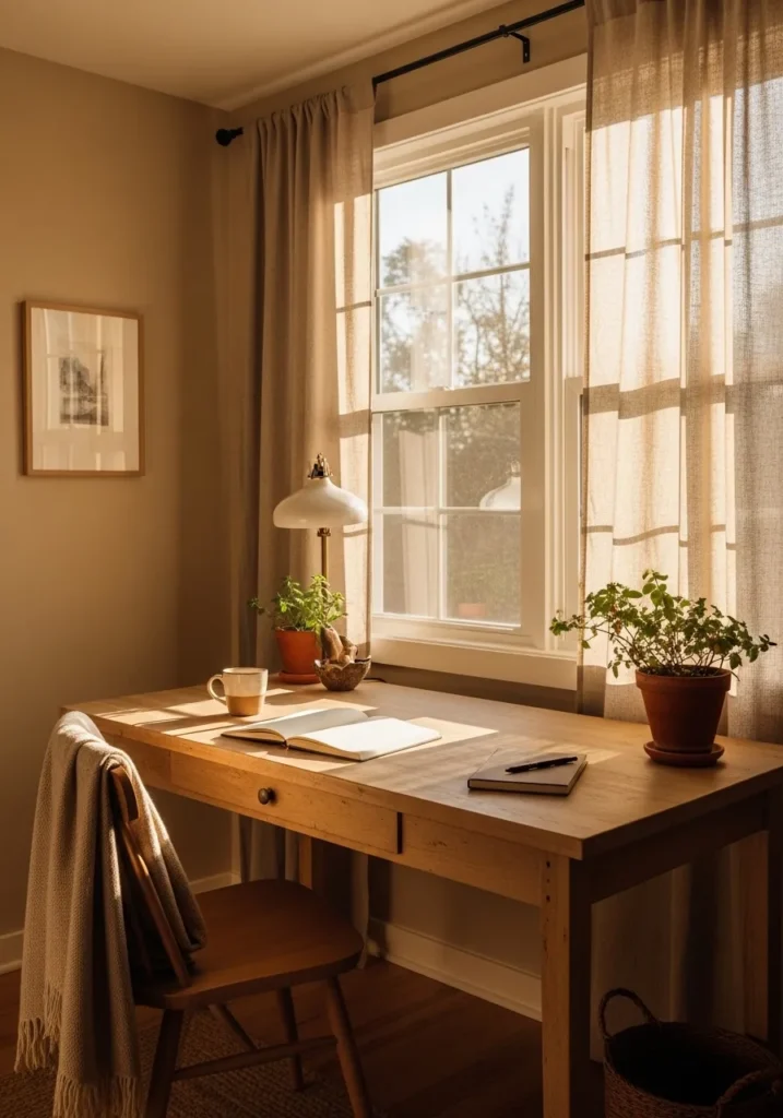 This office features a warm golden tan wall that feels soothing and welcoming. The paint color pairs beautifully with light wood furniture and sheer curtains that let in soft sunlight. The neutral shade creates a calm backdrop while still adding warmth and depth. A few simple plants and decor pieces complete the cozy atmosphere.