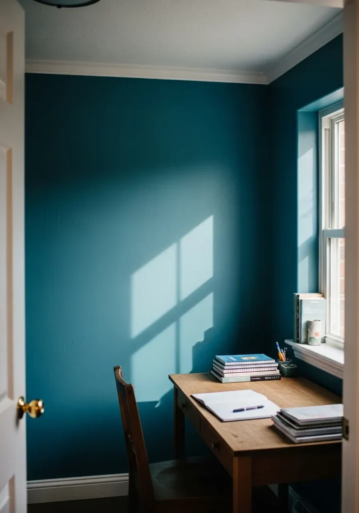 This compact office nook is wrapped in a rich teal blue that instantly makes the space feel focused and intentional. The color has just enough depth to feel dramatic, yet it still glows beautifully when sunlight pours in through the nearby window. The sharp window shadow cast across the wall adds contrast and highlights the subtle texture in the paint. A simple wooden desk sits neatly against the wall, styled with stacked notebooks and a clean writing surface that keeps the look uncluttered and calm.