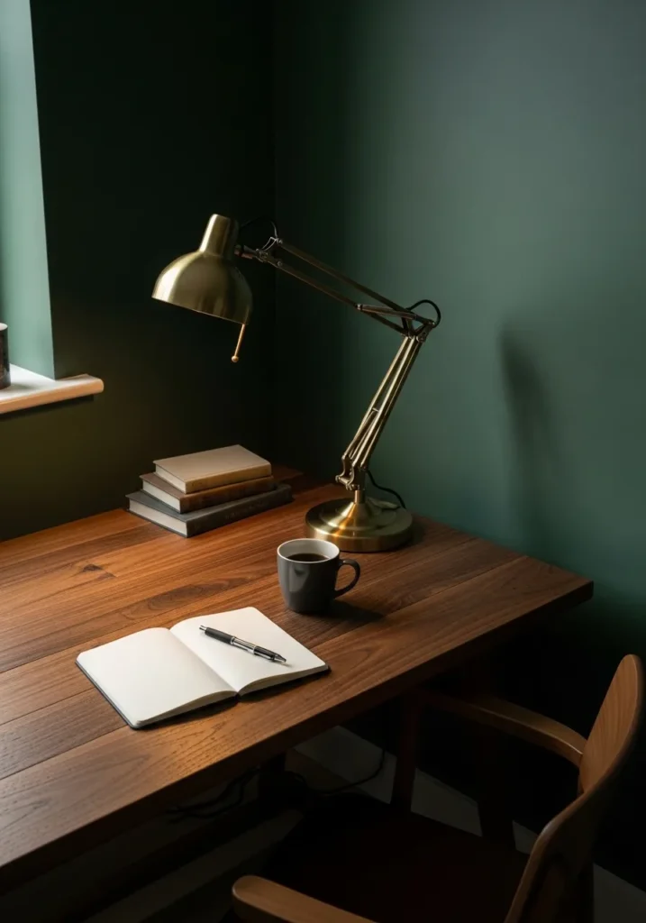 This workspace embraces a rich teal wall that adds depth and sophistication. The dark green blue tone wraps the desk area in a cozy atmosphere, making the wood desk and brass lamp stand out beautifully. Books and simple decor pieces sit neatly on the surface, keeping the look intentional and polished. The lighting feels warm and intimate, which enhances the dramatic effect of the paint color.