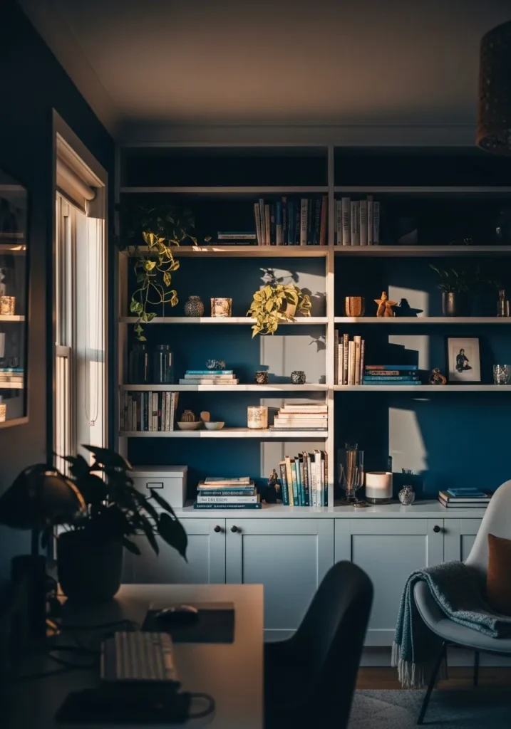 This office design features a bold navy wall paired with built in shelving that stretches across the space. The shelves are filled with books, decorative pieces, and greenery, all beautifully framed by the deep blue backdrop. A desk sits in front of the shelving, creating a layered and immersive workspace. The darker paint makes the lighter decor and soft furnishings pop, adding contrast and visual interest.
