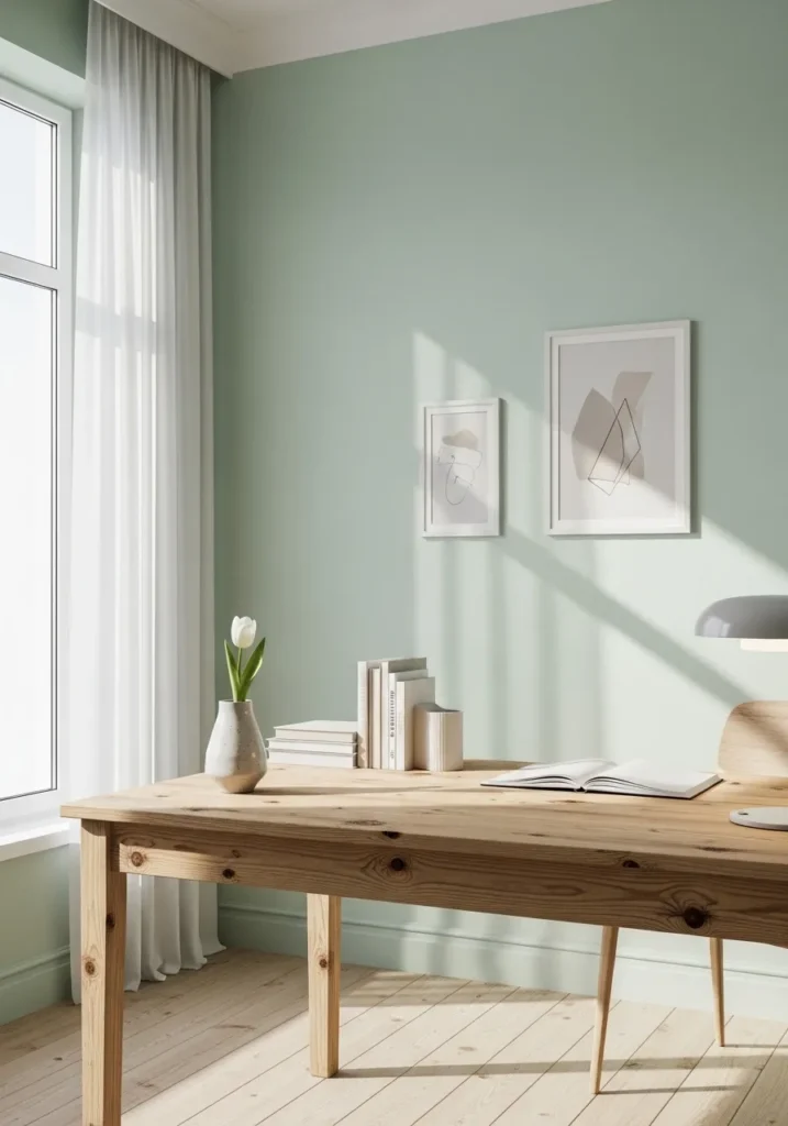 This office features a calming sage green wall paired with light wood furniture and sheer curtains. The soft green shade feels fresh and balanced, especially when natural light streams in through the tall window. A simple wooden desk sits against the wall, styled with minimal decor and framed artwork that complements the muted color palette. The overall look is clean, airy, and beautifully understated.