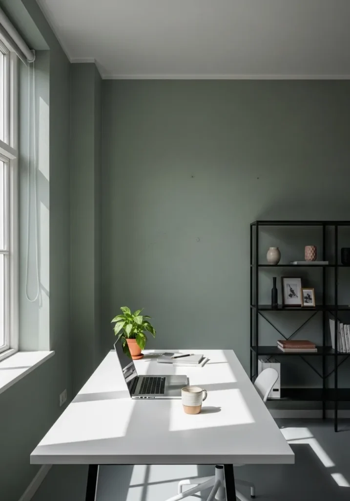 This room embraces a muted olive green wall that adds depth while still feeling modern. The simple white desk and minimal decor keep the focus on the paint color, allowing it to shine without competition. Sunlight casts soft shadows across the wall, highlighting the subtle undertones in the green. A small plant adds a touch of life and reinforces the natural feel of the palette.