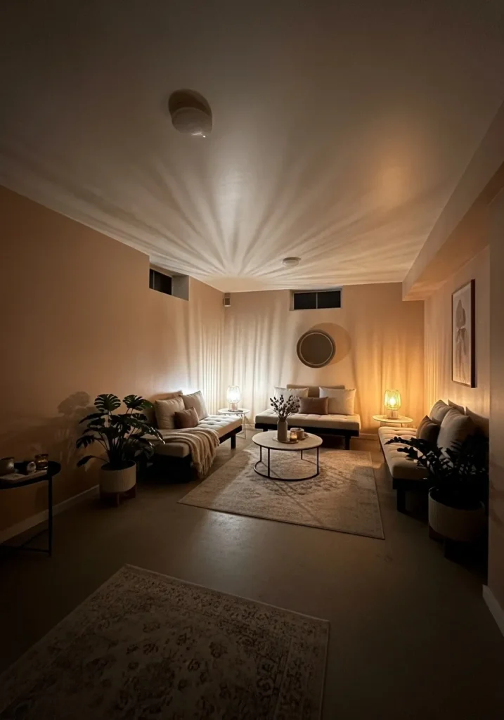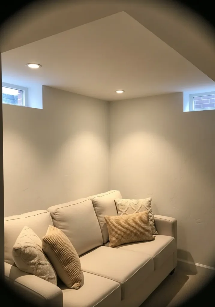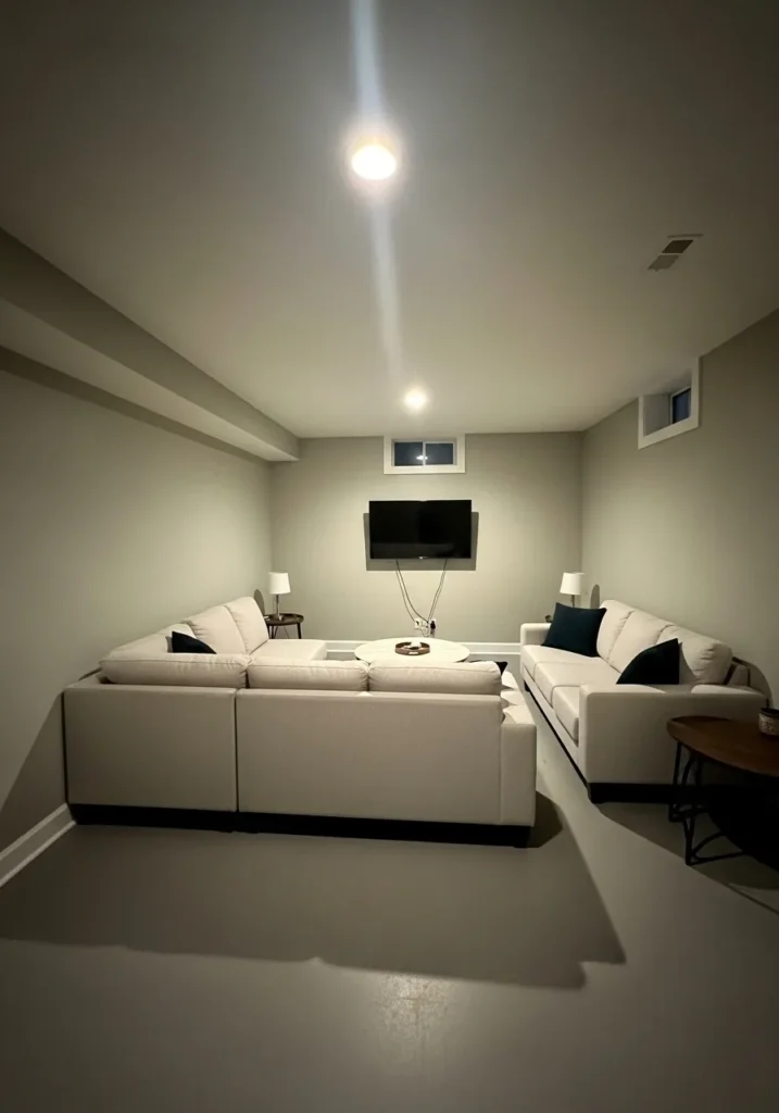 This basement lounge is painted in a soft beige that instantly makes the space feel more open. The light walls reflect both natural light from the small windows and recessed ceiling lights. Neutral seating and simple decor keep everything feeling airy and uncluttered.