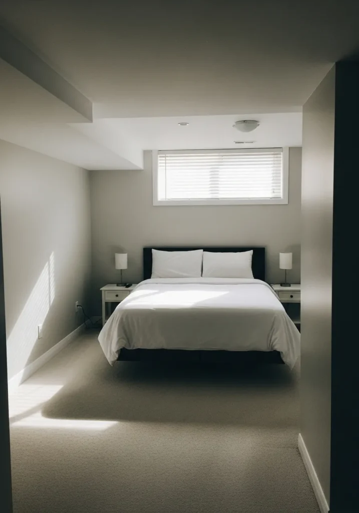 This basement bedroom features bright neutral walls that lift the entire space. The paint reflects light from the small window and helps the ceiling feel higher. Clean bedding and simple lines keep the room feeling open.