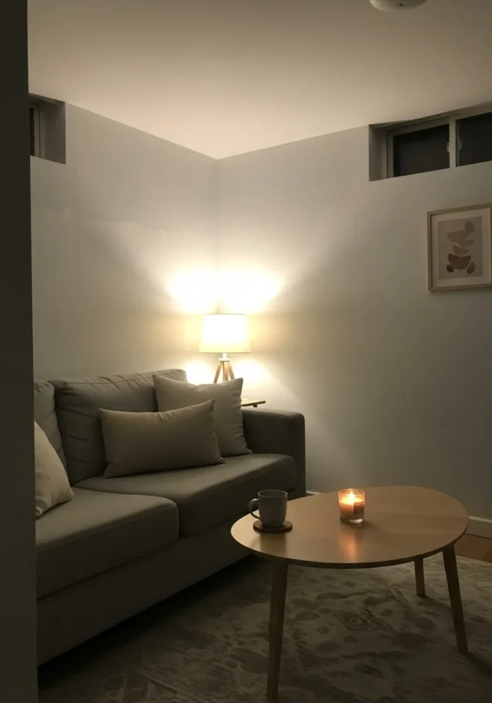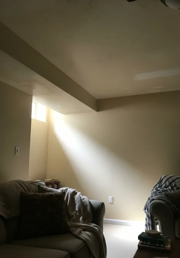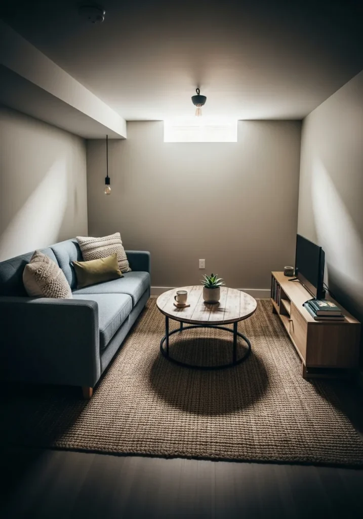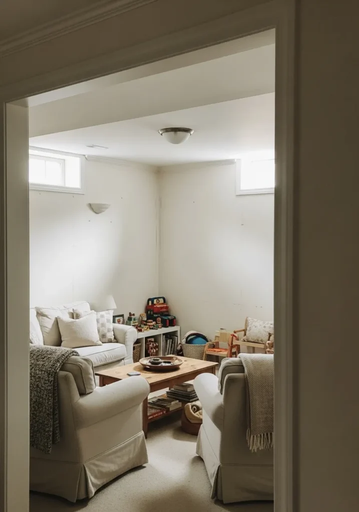 This basement seating area is painted in a soft beige that helps the walls visually recede. The light color reflects natural light from the small window and keeps the ceiling from feeling low. Plush seating and gentle shadows make the room feel wider and calmer.