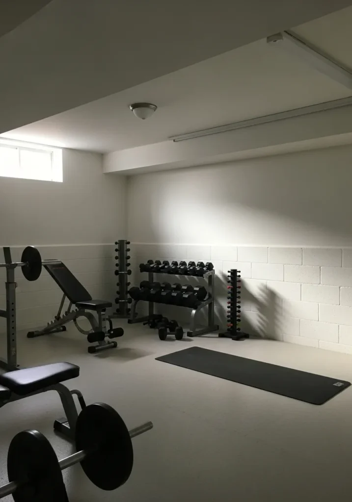 This home gym is painted in soft white to maximize brightness. The walls reflect light across the entire room, making the space feel wider and less enclosed. Simple finishes keep the focus on openness.