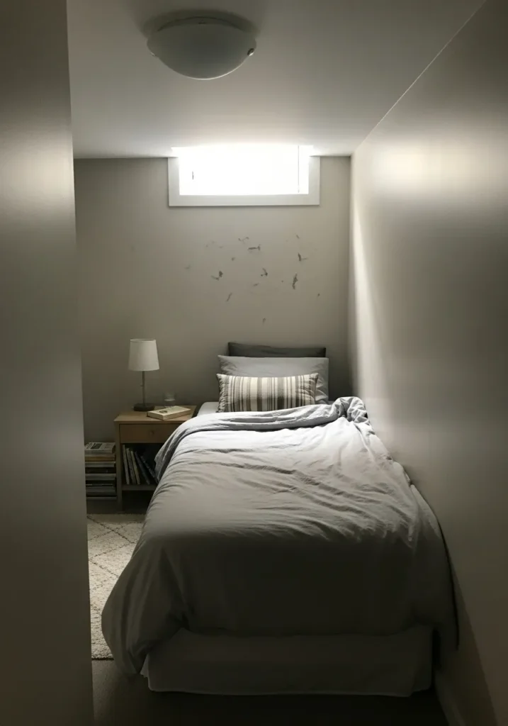This basement bedroom is painted in a pale neutral that lifts the space visually. The walls reflect light from the small window and help the ceiling feel higher. Simple bedding and clean lines keep the room feeling open.