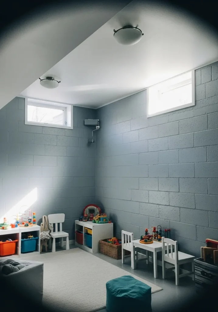 This play area is painted in a soft gray that helps the walls visually recede. The color reflects overhead lighting well and keeps the space from feeling boxed in. Simple furniture placement adds to the roomy feel.