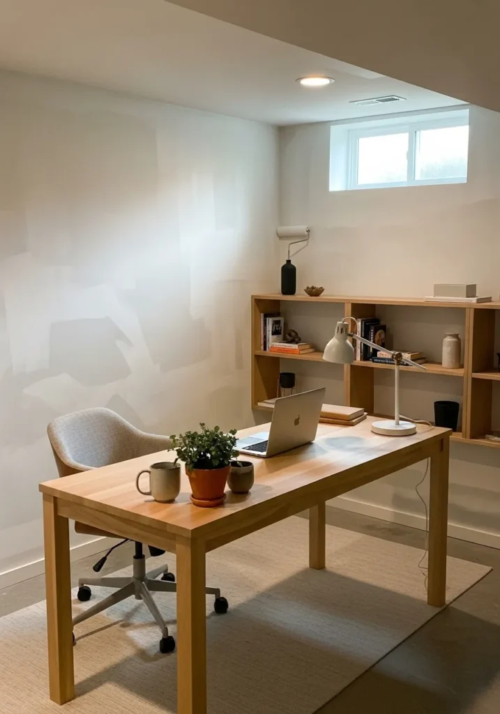 This workspace is painted in a light cream tone that visually stretches the room. The walls reflect both natural and task lighting, making the space feel wider and brighter. Open shelving keeps the layout feeling breathable.