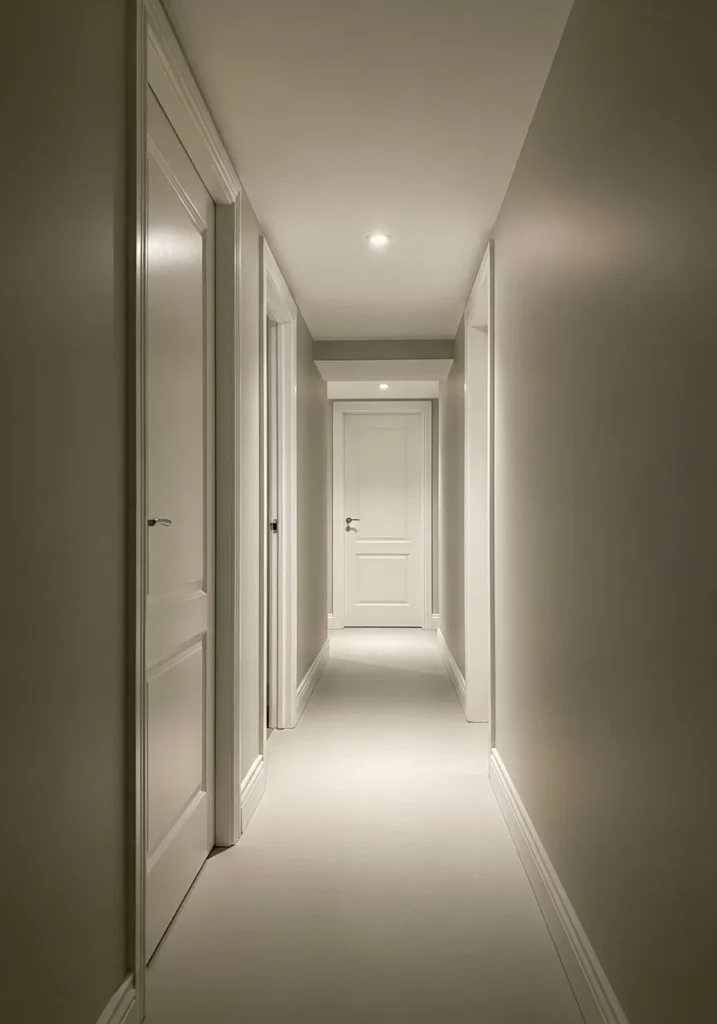 This hallway is painted in soft white to maximize light reflection. The color visually lengthens the space and keeps it from feeling narrow. Clean lines and simple doors enhance the open effect.