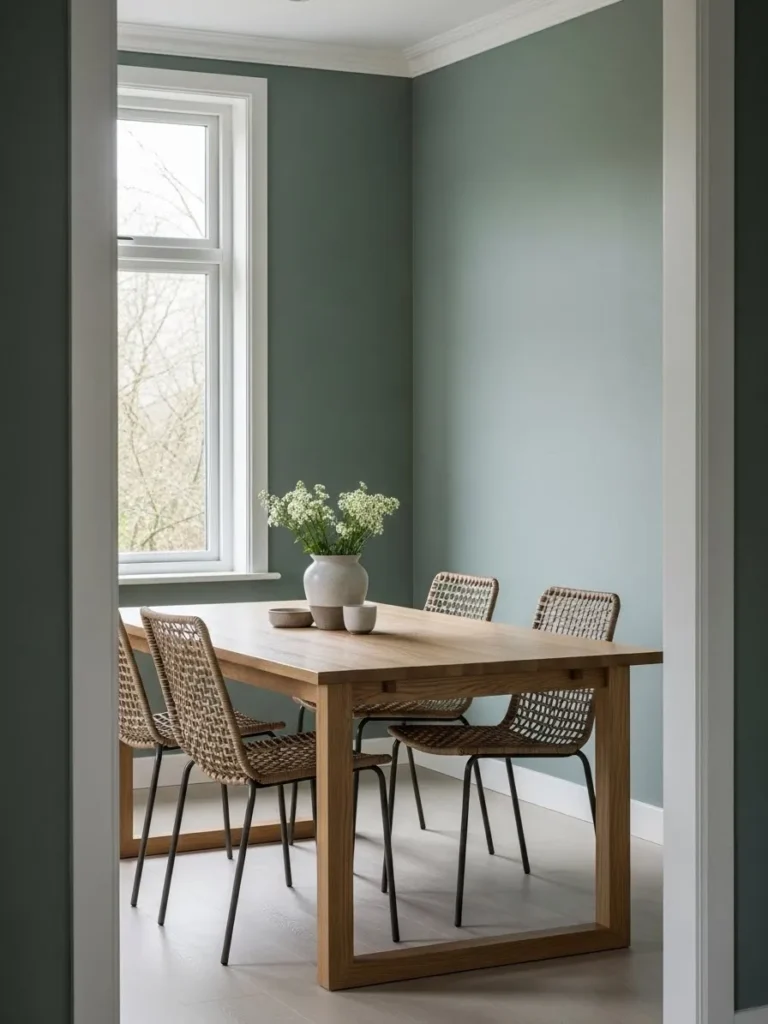 This dining room uses a soft sage green that feels calm and airy without looking flat. The color pairs beautifully with light wood furniture and woven dining chairs. Natural light from the tall window keeps everything fresh and balanced. The overall look feels modern but still warm and inviting.