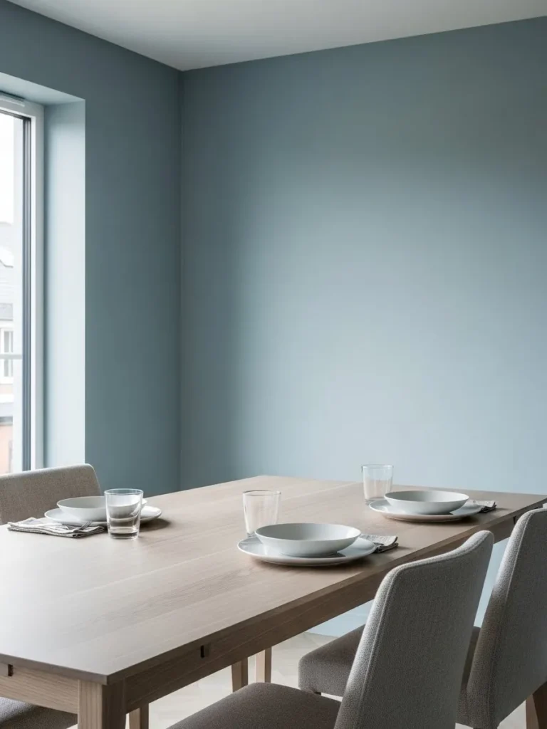 This dining room uses a cool blue gray that feels crisp and modern. The darker dining table creates contrast against the lighter walls. Minimal decor keeps the focus on the color and furniture. Natural light adds softness so the space never feels cold.