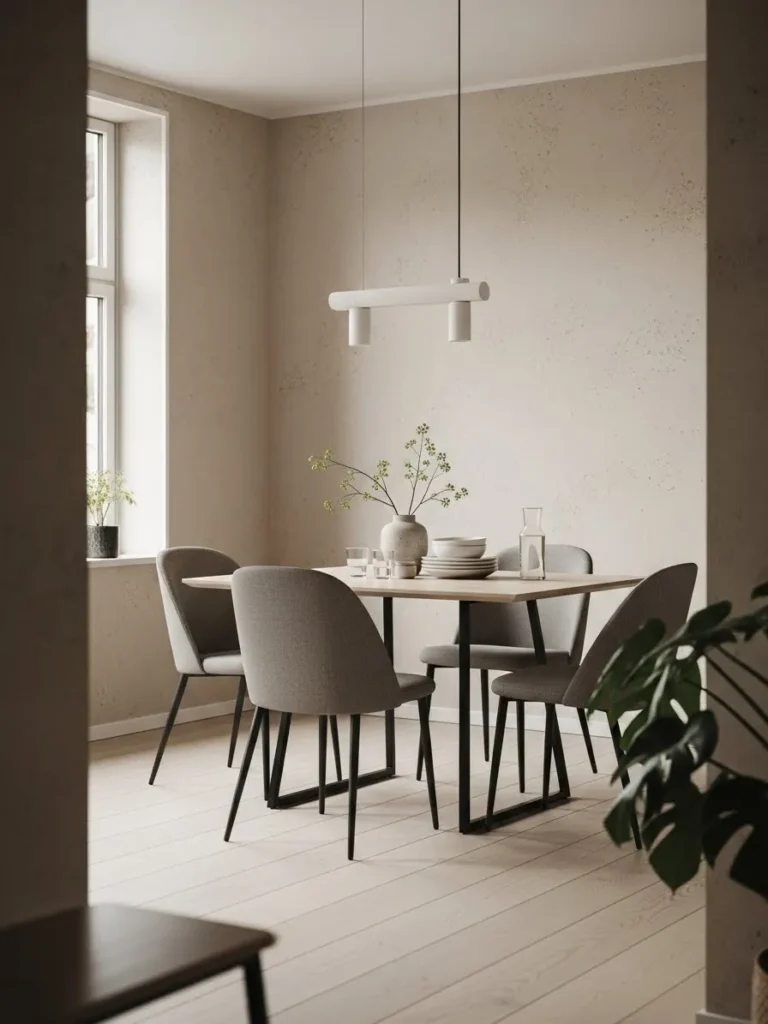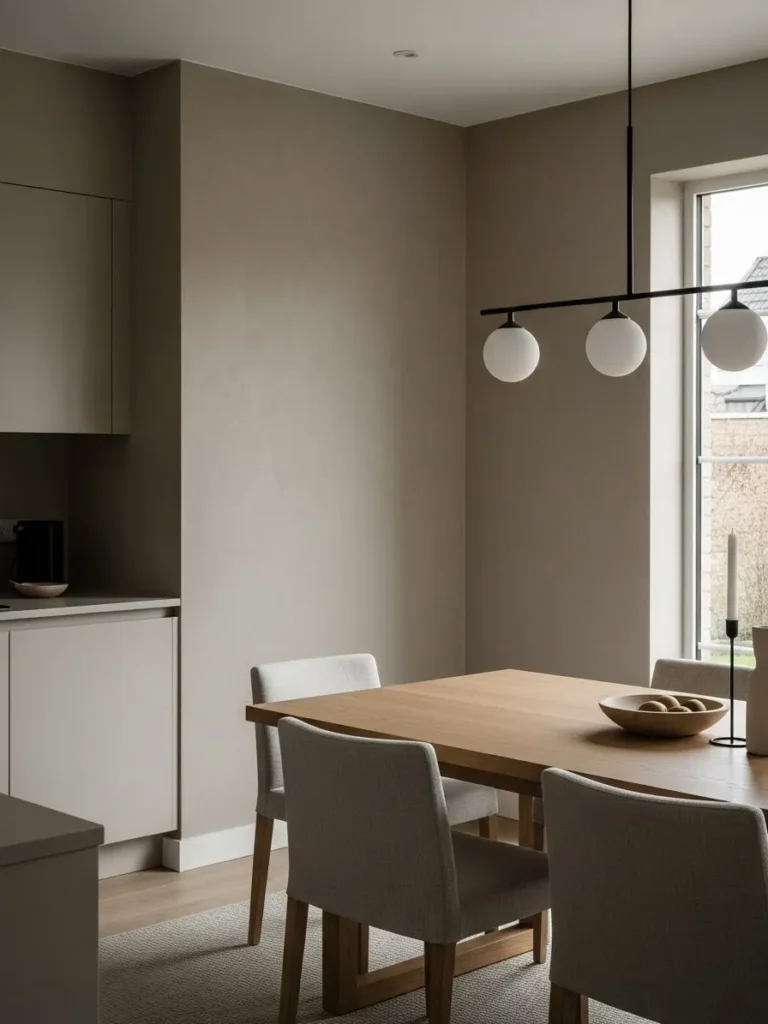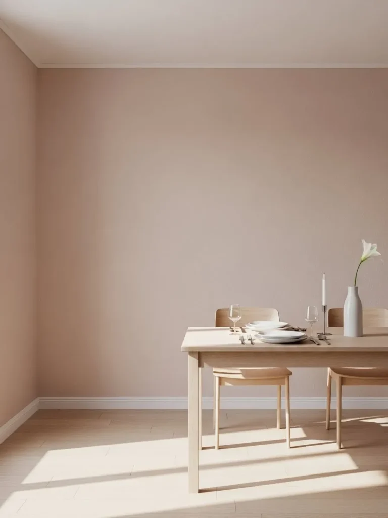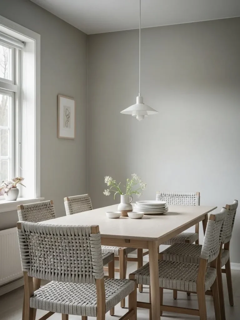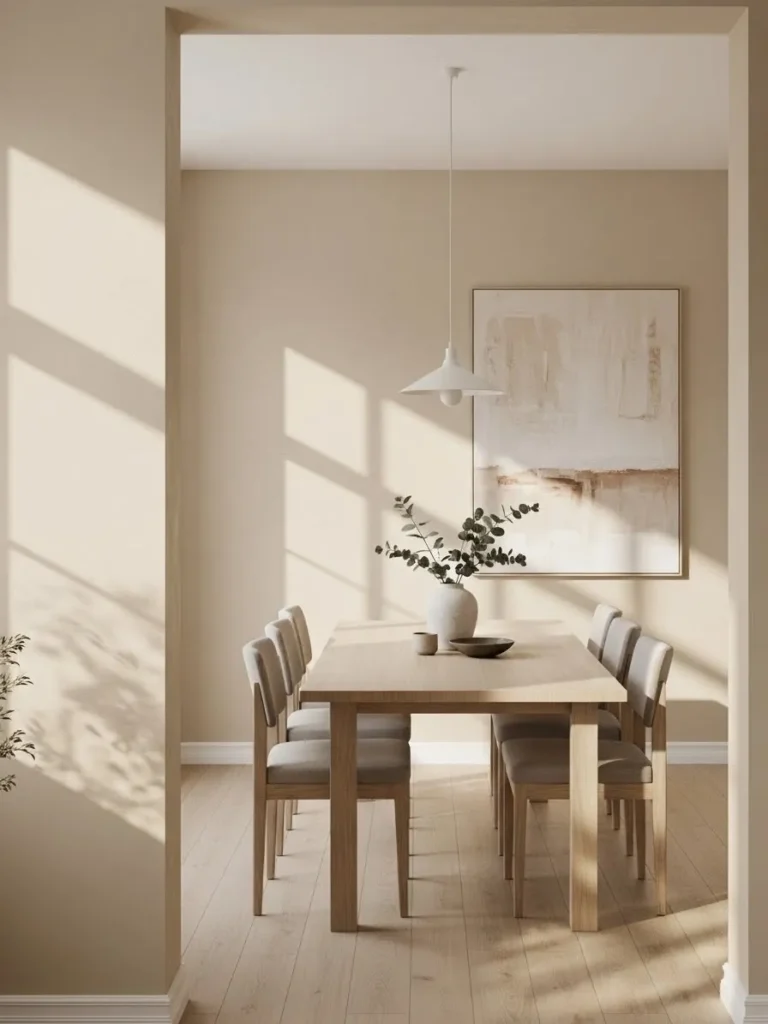 This dining room features a soft blush beige that feels warm and fresh. Light wood furniture enhances the airy Scandinavian vibe. The color reflects light beautifully and keeps the room feeling open. Everything feels gentle and well balanced.