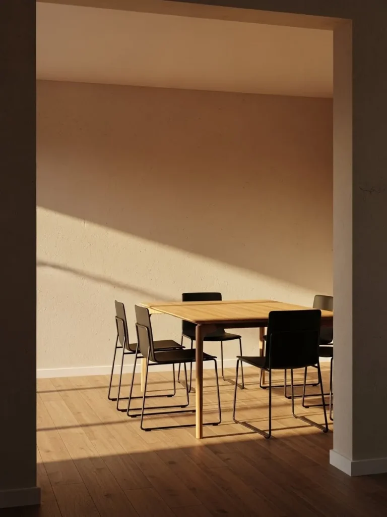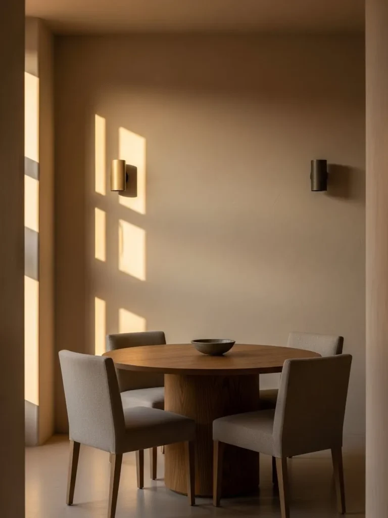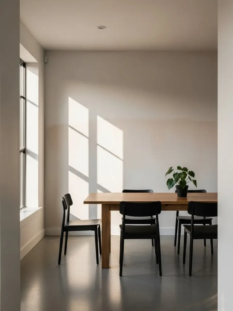 This dining room features a soft beige wall color that glows beautifully in natural sunlight. The warm tone makes the space feel cozy without feeling dark. Simple furniture and clean lines keep the look modern. The sunlight creates gentle shadows that add depth to the room.