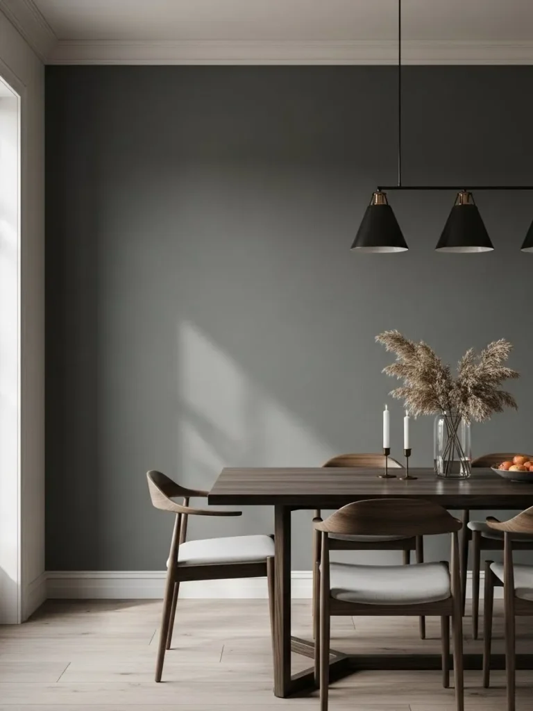 This dining room is painted in a deep charcoal that feels dramatic yet refined. The darker walls create a strong contrast with lighter floors and furniture. Simple pendant lighting adds structure without clutter. The space feels bold but still balanced.
