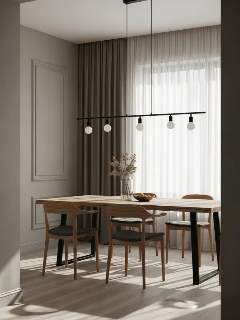 This space leans into a warm greige tone that feels modern and timeless at the same time. Floor length curtains soften the room while the wooden table and chairs add warmth. The pendant lighting keeps the look clean and minimal. Everything feels intentional but not stiff.