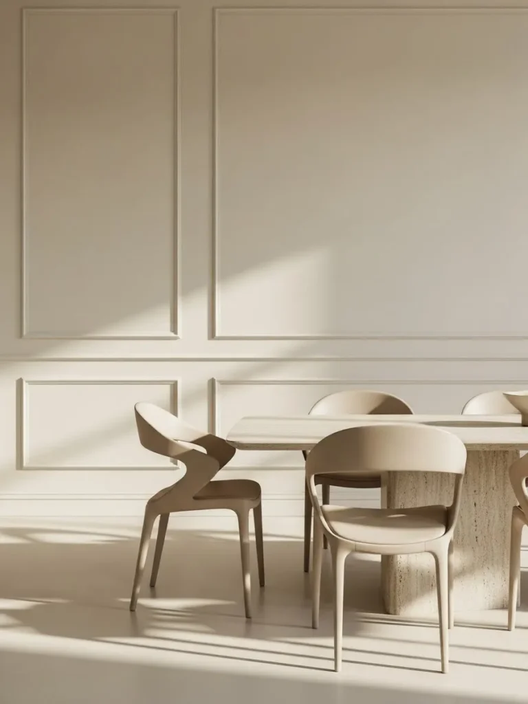 This dining room features a creamy beige wall color paired with classic panel molding. The soft shade reflects light beautifully and keeps the space feeling open. Neutral furniture blends seamlessly with the walls for a very cohesive look. Everything feels calm and thoughtfully styled.
