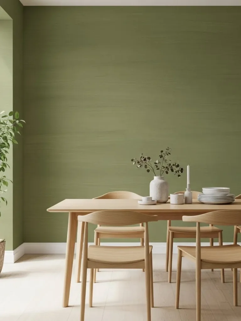 This dining room uses a muted olive green that feels earthy and grounded. The color adds depth while still keeping the space fresh. Light wood furniture softens the green and brings warmth into the room. The overall look feels relaxed and modern at the same time.