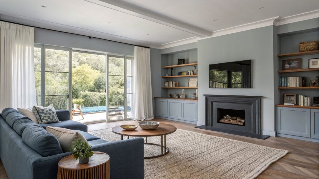 This living room pulls off a pale blue on the walls. It has that soft blue-gray tone close to Sherwin-Williams Sea Salt or Benjamin Moore Palladian Blue, maybe even Behr’s Blue Whisper. What I like about it is how fresh it feels without being too bold. It lets the white trim and big windows do their thing, keeping everything airy.