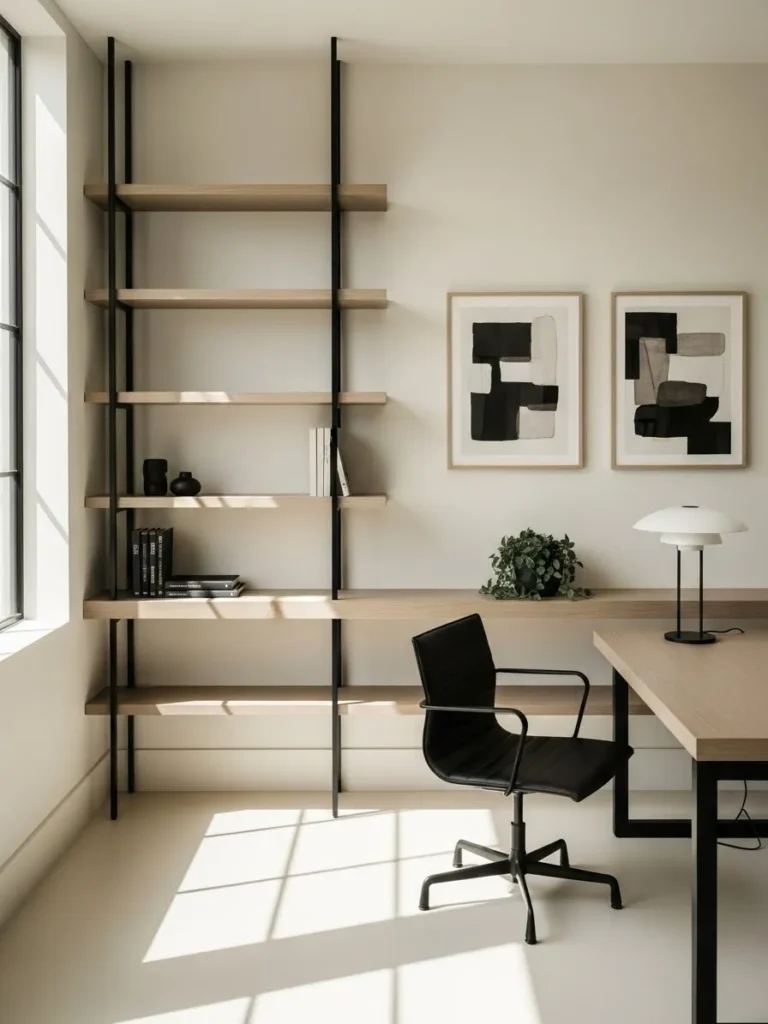 This modern home office keeps things light and effortless with soft neutral walls that bounce natural light around the room. The warm off white paint pairs beautifully with pale wood shelving and a clean lined desk, creating a space that feels airy but still grounded. Black metal accents on the shelving and chair add just enough contrast to keep the look sharp without feeling heavy. Minimal decor, simple artwork, and plenty of open space make the room feel organized, calm, and very on trend for a fresh work setup.