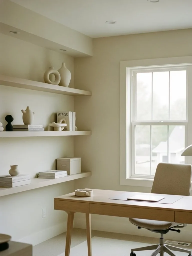 This home office leans into a soft warm cream paint color that instantly makes the space feel calm and welcoming without looking flat. The walls pair beautifully with the light wood desk and floating shelves, creating that airy modern look so many of us love right now. Natural daylight pours in through the window and bounces gently off the creamy walls, making the whole room feel brighter and more open. The neutral palette keeps everything cohesive, while the sculptural decor and simple shelving add just enough personality without visual clutter.