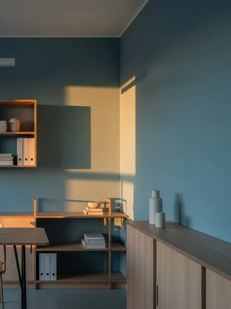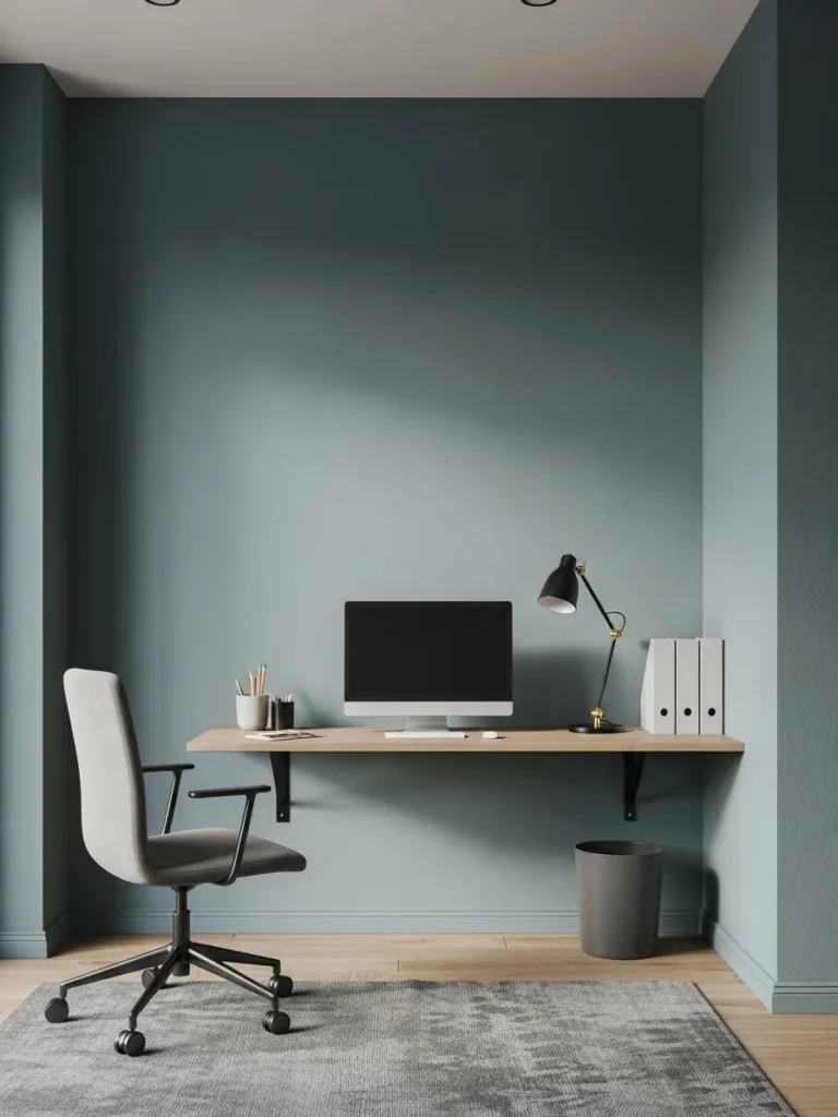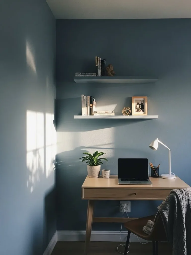 This home office design leans into a calm muted blue wall color that instantly makes the space feel focused and airy. The paint has a soft gray undertone which keeps it modern and grown up rather than overly colorful. Paired with light wood flooring and a simple floating desk the whole setup feels clean and intentional without trying too hard. The minimal styling with a sleek desk lamp neutral chair and subtle storage keeps visual clutter low which makes the color really shine. It is the kind of blue that changes gently with the light and always feels fresh.