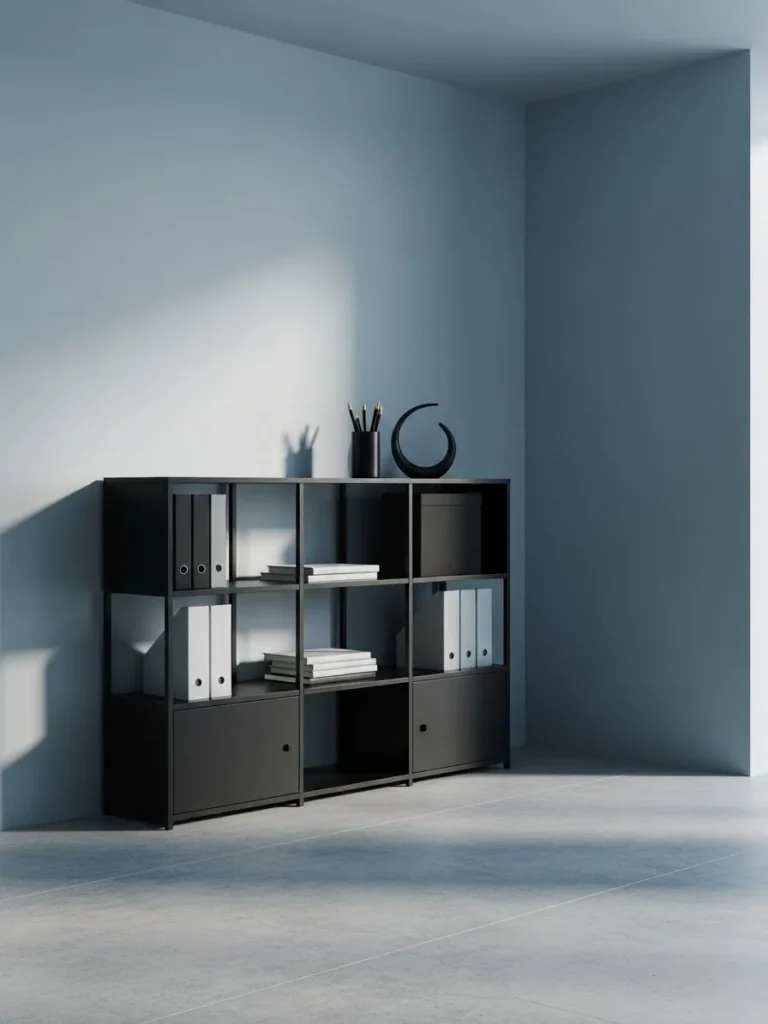 This office design leans into a soft cool blue wall color that instantly feels calm and modern without trying too hard. The clean walls reflect natural light beautifully which keeps the space feeling open and airy even with minimal decor. A sleek black shelving unit adds contrast and structure while keeping everything tidy and intentional. The overall look is very pared back but still warm thanks to the gentle color choice and simple styling. It is the kind of office that feels quiet in the best way and lets your focus settle naturally.