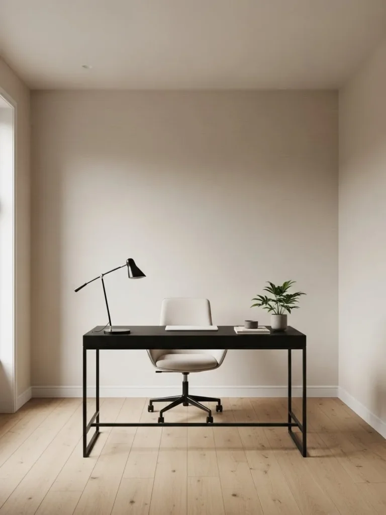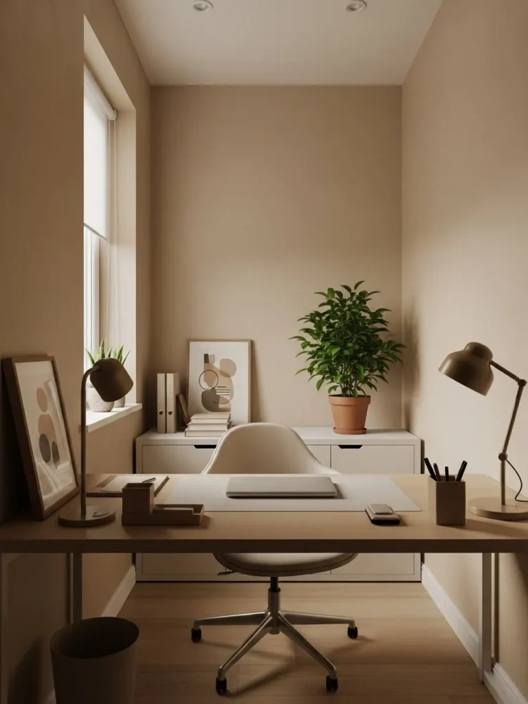 This cozy little home office makes the most of a narrow space with soft warm neutral walls that instantly feel calm and inviting. The paint color sits right between beige and light taupe, which keeps the room from feeling cold while still looking modern and clean. Natural light pours in through the window and plays beautifully off the subtle wall texture, while the simple wooden desk and matching chair add warmth without visual clutter. Minimal styling with a small plant, a sleek desk lamp, and just a few essentials keeps the whole setup feeling intentional and airy instead of cramped.
