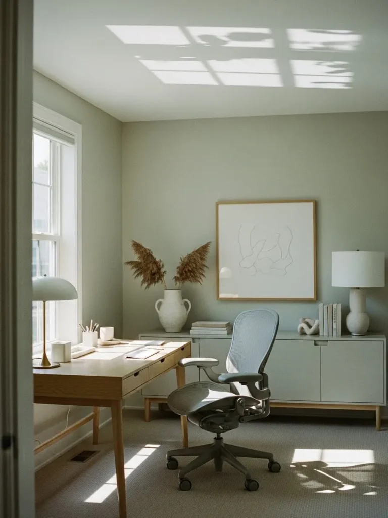 This home office feels calm and collected thanks to those soft sage green walls that instantly set a relaxed mood. The color sits perfectly between green and gray, which makes the space feel grounded without going dark. Natural light pours in from the window and plays beautifully across the walls, bouncing softly off the light wood desk and low storage cabinet. The overall look is clean but not cold, with cozy textures like the carpeted floor, subtle artwork, and those dried grasses adding just enough warmth and personality to keep it from feeling too minimal.