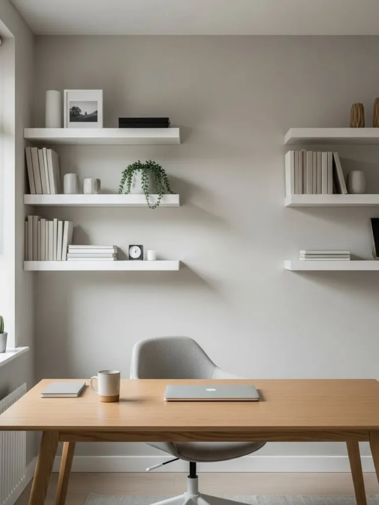 This modern home office keeps things light and grounded with soft greige walls that instantly feel fresh and current. The paint color sits perfectly between warm and cool, which makes the room feel balanced and calm without leaning dull. Clean white floating shelves create an airy look against the walls while keeping the styling simple and intentional. Light wood furniture adds warmth and contrast, and the neutral decor choices keep everything cohesive and clutter free. Natural daylight from the window makes the wall color shift subtly throughout the day, which adds depth without any bold statements.