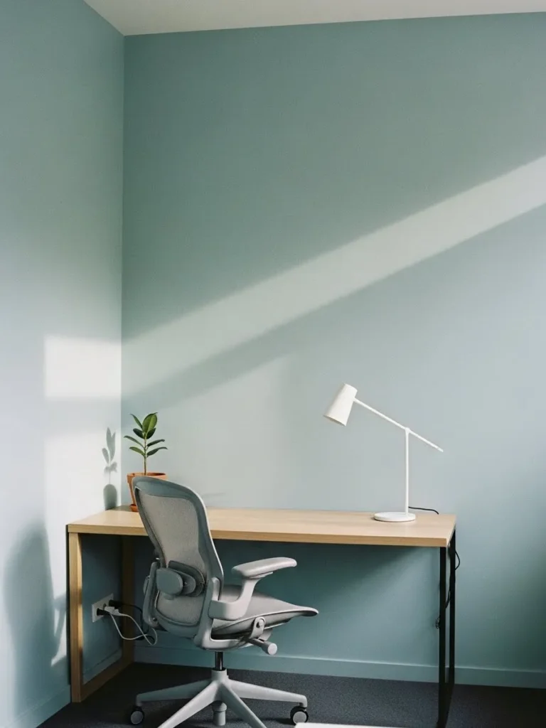 This modern office keeps things calm and uncluttered with soft sage green walls that feel fresh without trying too hard. The color has a gentle muted quality that reflects natural light beautifully and makes the room feel airy and open. A simple wood desk adds warmth while the clean white desk lamp and ergonomic chair keep the look modern and practical. The overall vibe is minimal but not cold with just enough texture and softness to feel inviting rather than stark.