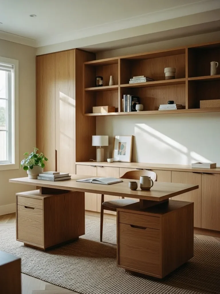 This modern home office leans into soft neutral paint colors paired with warm wood tones for a look that feels calm, fresh, and quietly stylish. The walls stay light and airy which lets all that beautiful natural wood cabinetry shine without feeling heavy. Clean built in shelves add structure while still feeling relaxed thanks to simple styling with books, ceramics, and a touch of greenery. The desk setup is minimal and practical, with smooth wood surfaces and hidden storage that keeps the space feeling open and uncluttered. Natural light plays a big role here, bouncing off the pale walls and warming up the wood finishes for an easygoing, modern vibe.