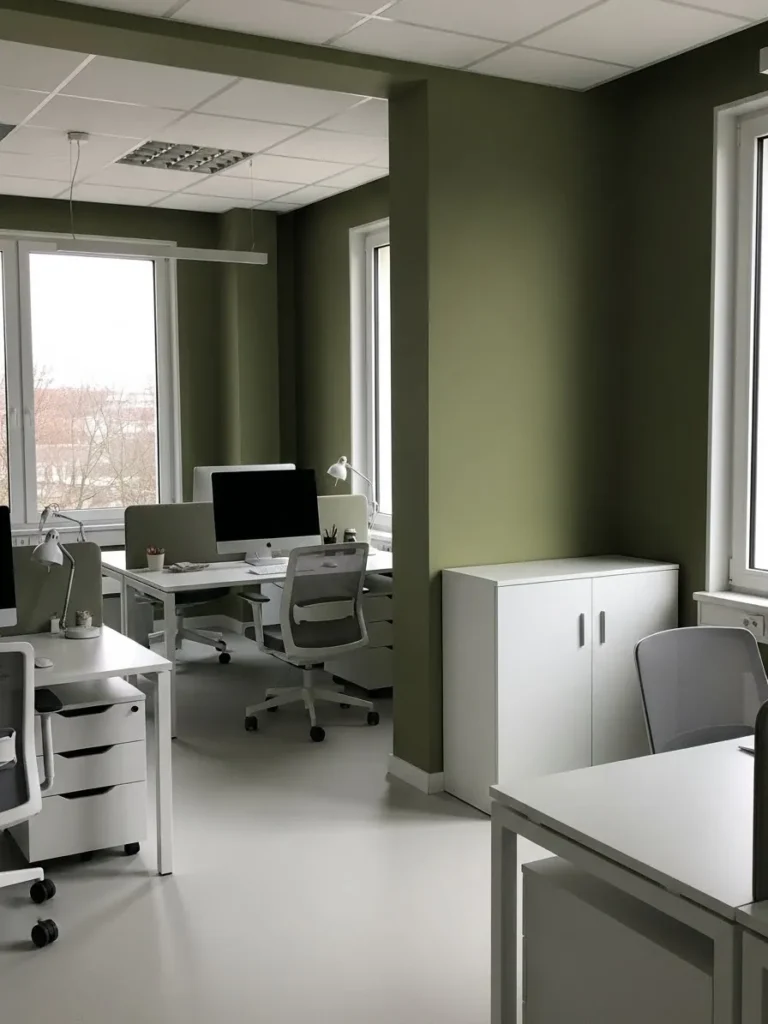 This modern office design uses a soft olive green on the walls to create a calm and grounded feel that still looks fresh and current. The color pairs beautifully with the crisp white desks, cabinets, and chairs, keeping the space bright and uncluttered. Large windows bring in plenty of natural light, which softens the green even more and prevents it from feeling heavy. Clean lines, simple furniture, and minimal decor give the room a polished look that feels functional without being cold or boring.