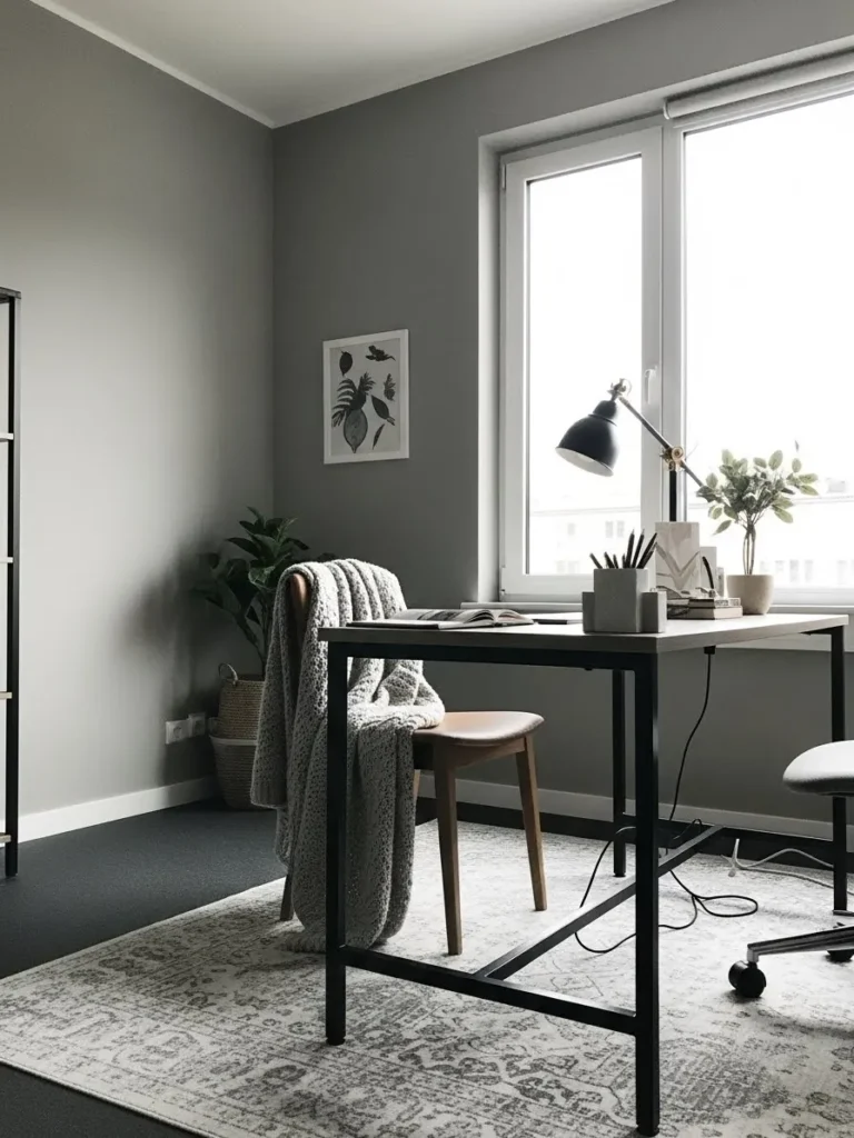 This home office leans into soft gray walls that feel modern without tipping into cold or boring. The paint color sets a calm backdrop that lets the simple black desk frame and light wood chair really shine. Natural light pours in through the window and keeps the gray feeling fresh instead of flat. Minimal decor like the botanical print, cozy throw, and a few leafy plants adds warmth and personality while still keeping the space clean and uncluttered. Everything feels intentional but relaxed which is exactly what you want in a modern work setup.
