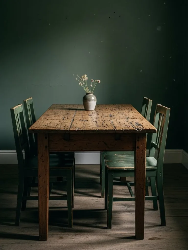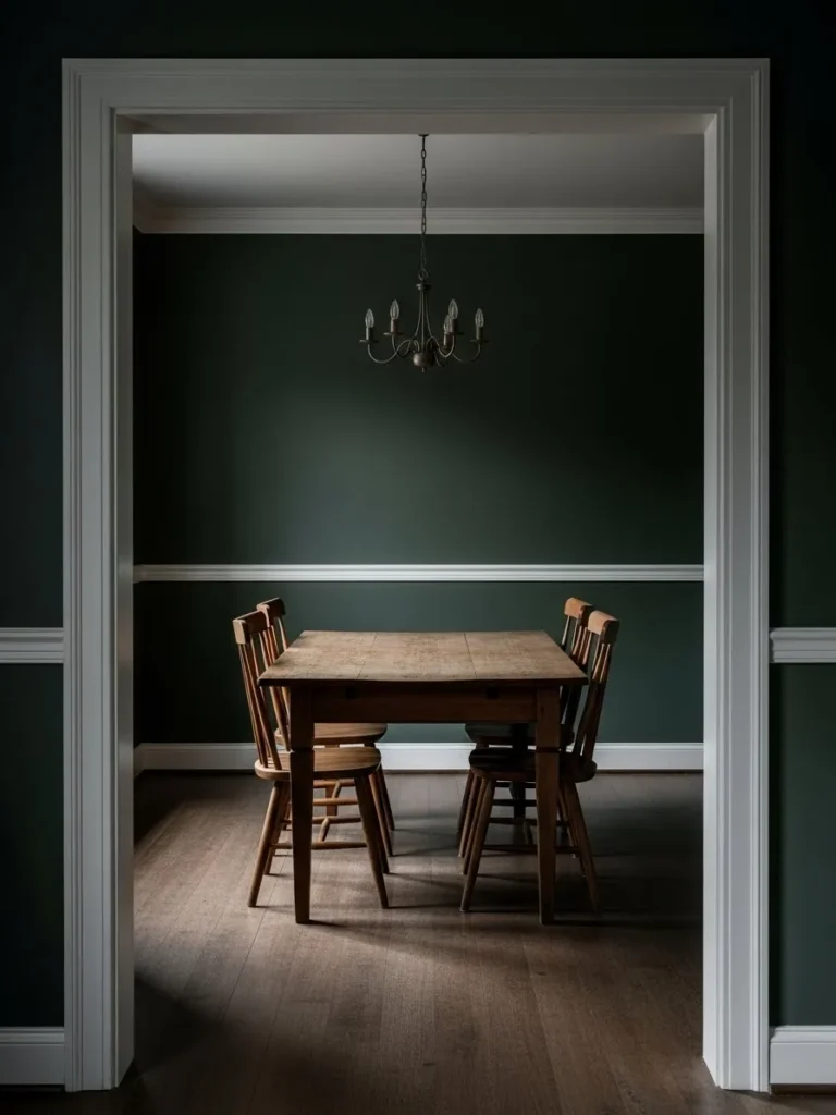 This dining room is wrapped in a deep moss green that feels earthy and calm. The color pairs perfectly with the rustic wooden table and simple chairs. Minimal decor allows the paint color to stand out. The room feels grounded and quietly dramatic.