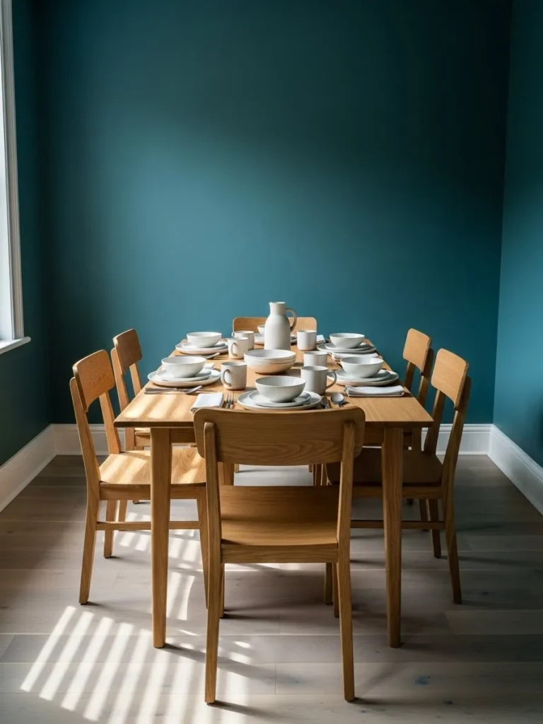 This dining room features a bold teal blue that brings depth and character to the space. The color pairs beautifully with light wood furniture and clean lines. Natural light brightens the room and keeps the shade feeling fresh instead of dark. The overall design feels balanced and modern.