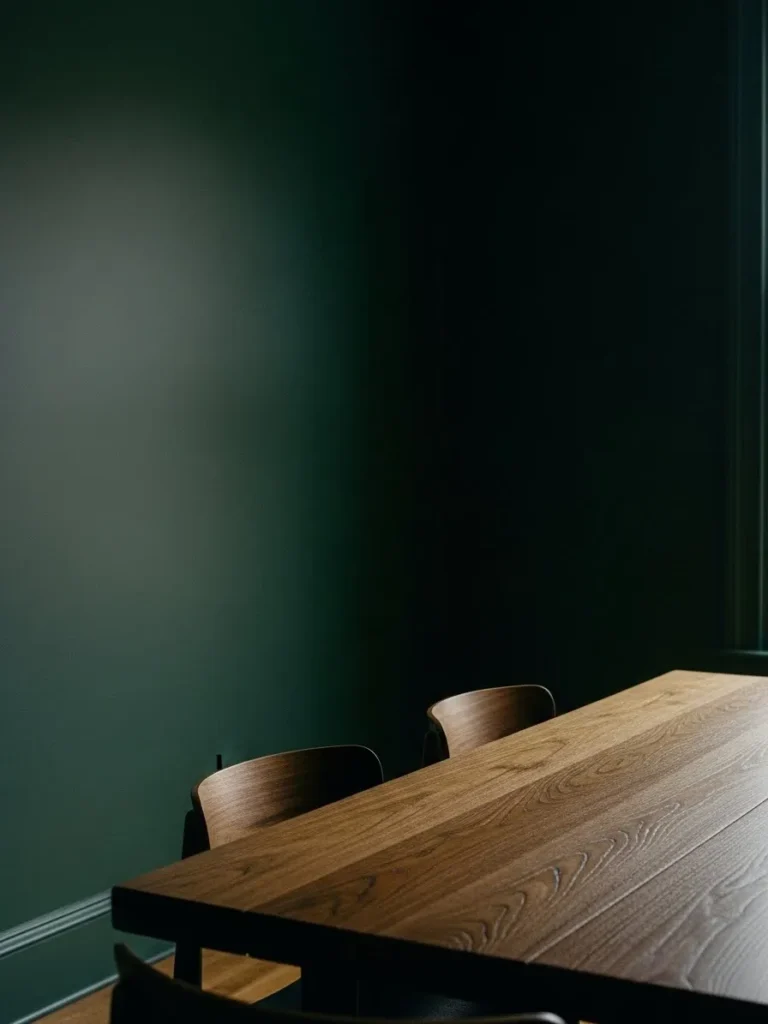 A deep forest green wraps this dining room in a rich and cozy mood. The walls feel dramatic while the wooden table keeps things grounded and warm. Minimal decor allows the color to take center stage. The space feels elegant but easy to live with.