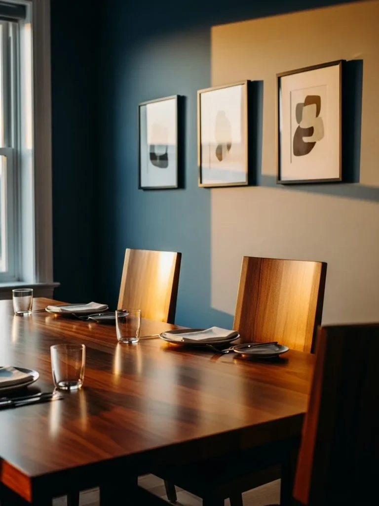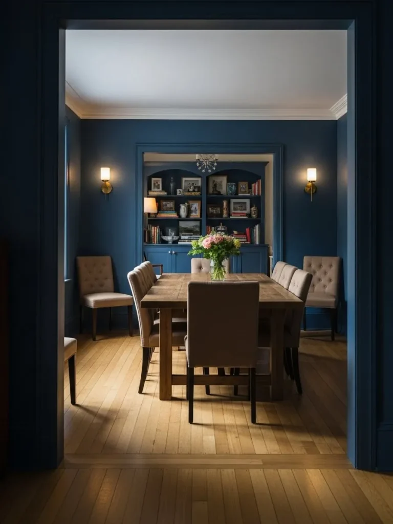 This dining room uses a deep navy blue that feels bold and sophisticated. The darker walls contrast beautifully with warm wood furniture and framed artwork. Light from the window softens the color and adds dimension. The space feels stylish without feeling formal.