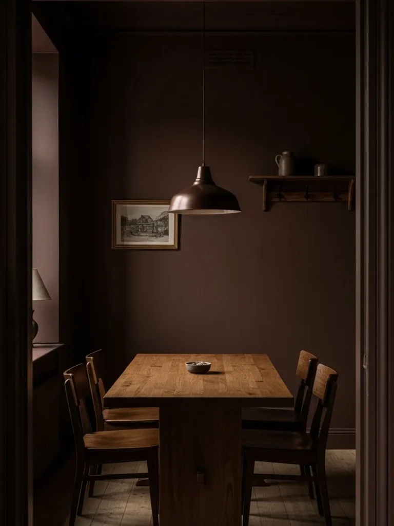 Deep cocoa brown walls give this dining room a cozy and intimate feel. The darker color wraps the space and makes it feel private and calm. Simple furniture and soft lighting keep the room from feeling heavy. Everything feels thoughtful and understated.