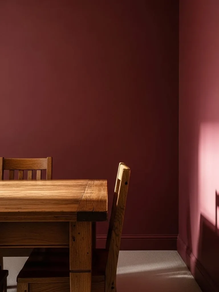 This dining room uses a deep burgundy shade that adds instant depth and warmth. The color feels rich and dramatic without overpowering the space. Paired with natural wood furniture the room feels grounded and intentional. Soft light adds warmth and highlights the depth of the walls.