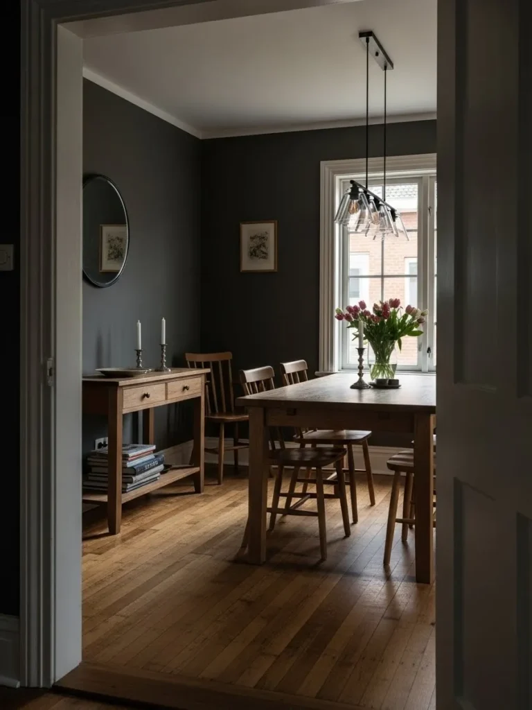 This dining room features a soft charcoal wall color that adds depth and contrast. Warm wood floors and simple furniture keep the space feeling inviting. Natural light moves easily through the room and softens the darker tone. The overall look feels balanced and calm.