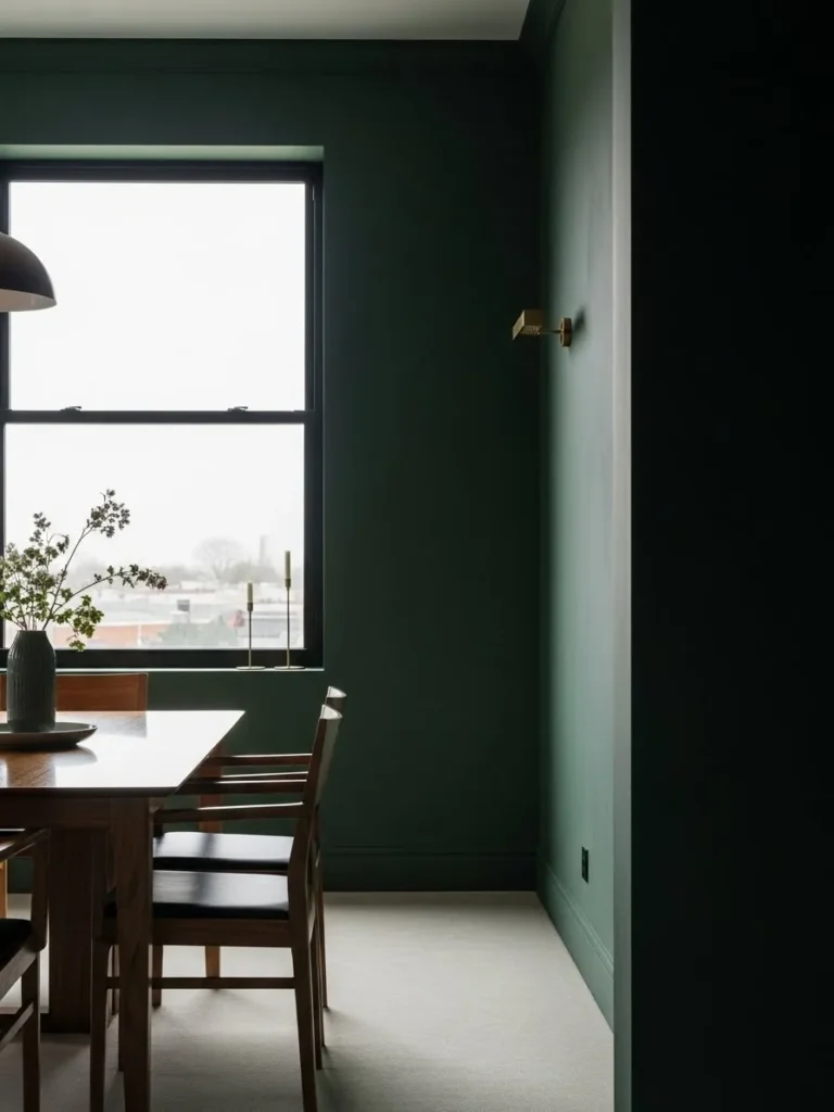 I love how this room feels serious but still cozy. It reminds me of a space made for slow dinners and long conversations. The green walls feel bold without trying too hard. This is the kind of color that makes everyday meals feel a little more special.