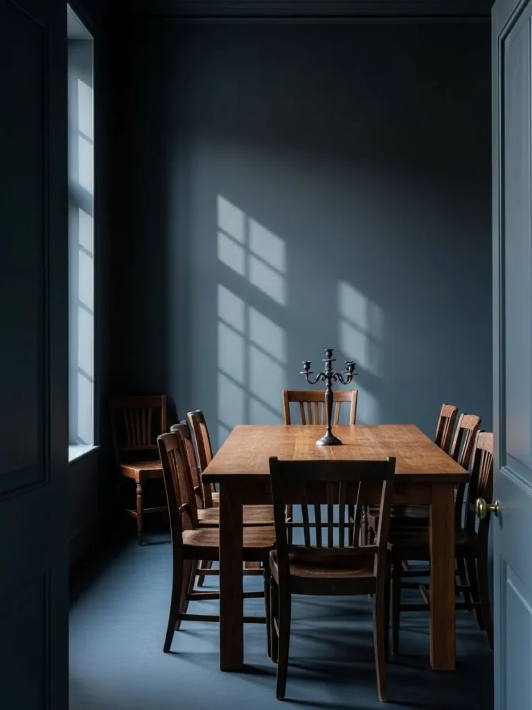 A dark blue wall color sets a calm and sophisticated tone in this dining room. The shade works beautifully with warm wood furniture and soft textiles. Natural light filters through the curtains and adds depth to the color. The space feels layered and inviting.